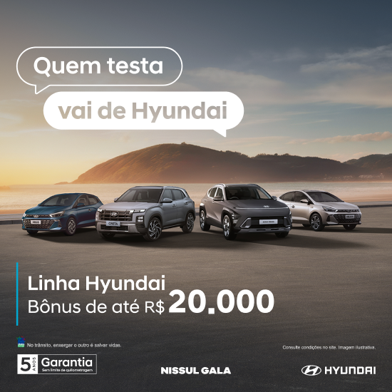 Na Nissul Gala você encontra toda linha Hyundai 0km, além de seminovos de diversas marcas e modelos, com a garantia e procedência que você procura. Além de veículos novos e seminovos, você também conta com um pós venda altamente qualificado e um serviço de peças genuínas Hyundai com os melhores preços. Confira nossas ofertas e fique mais próximo do seu carro novo! A Nissul Gala Hyundai está sempre pronta a oferecer o padrão de qualidade e sofisticação que acompanha seus veículos Hyundai.